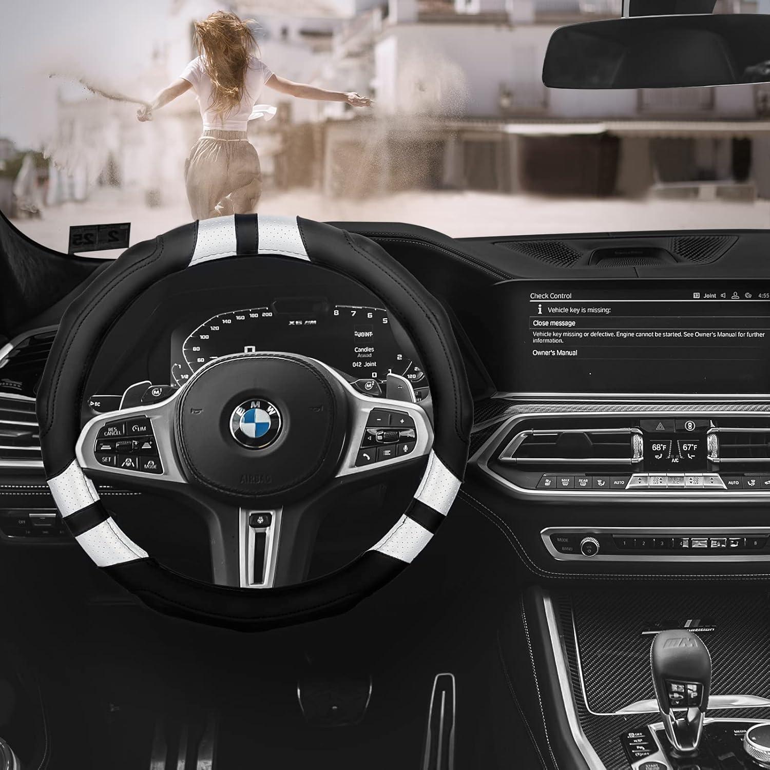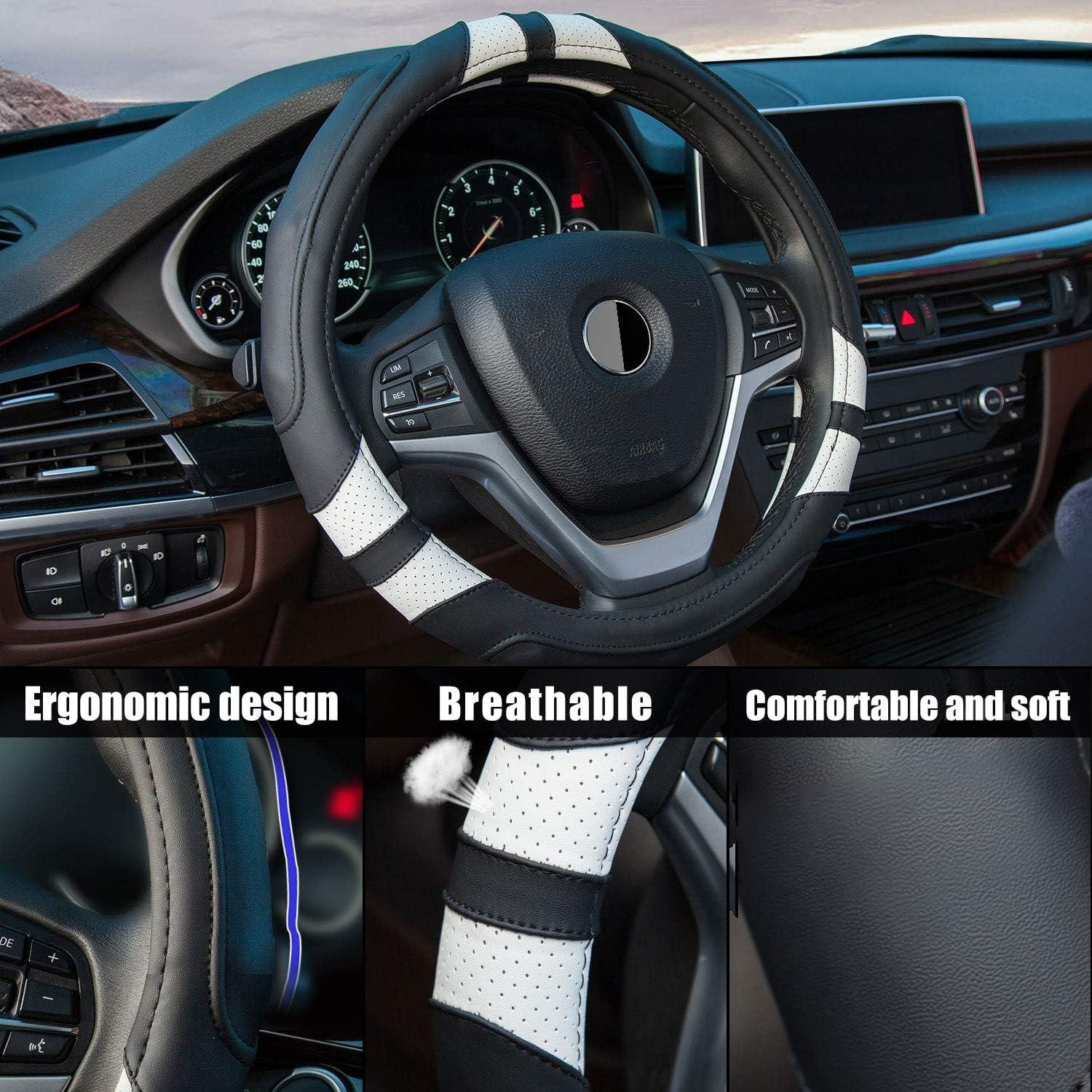 Achiou Blue Car Steering Wheel Cover Universal 15 inch with Grip Contours, Leather Auto for Men and Women Non-Slip Breathable Soft and Comfortable(Black + White)