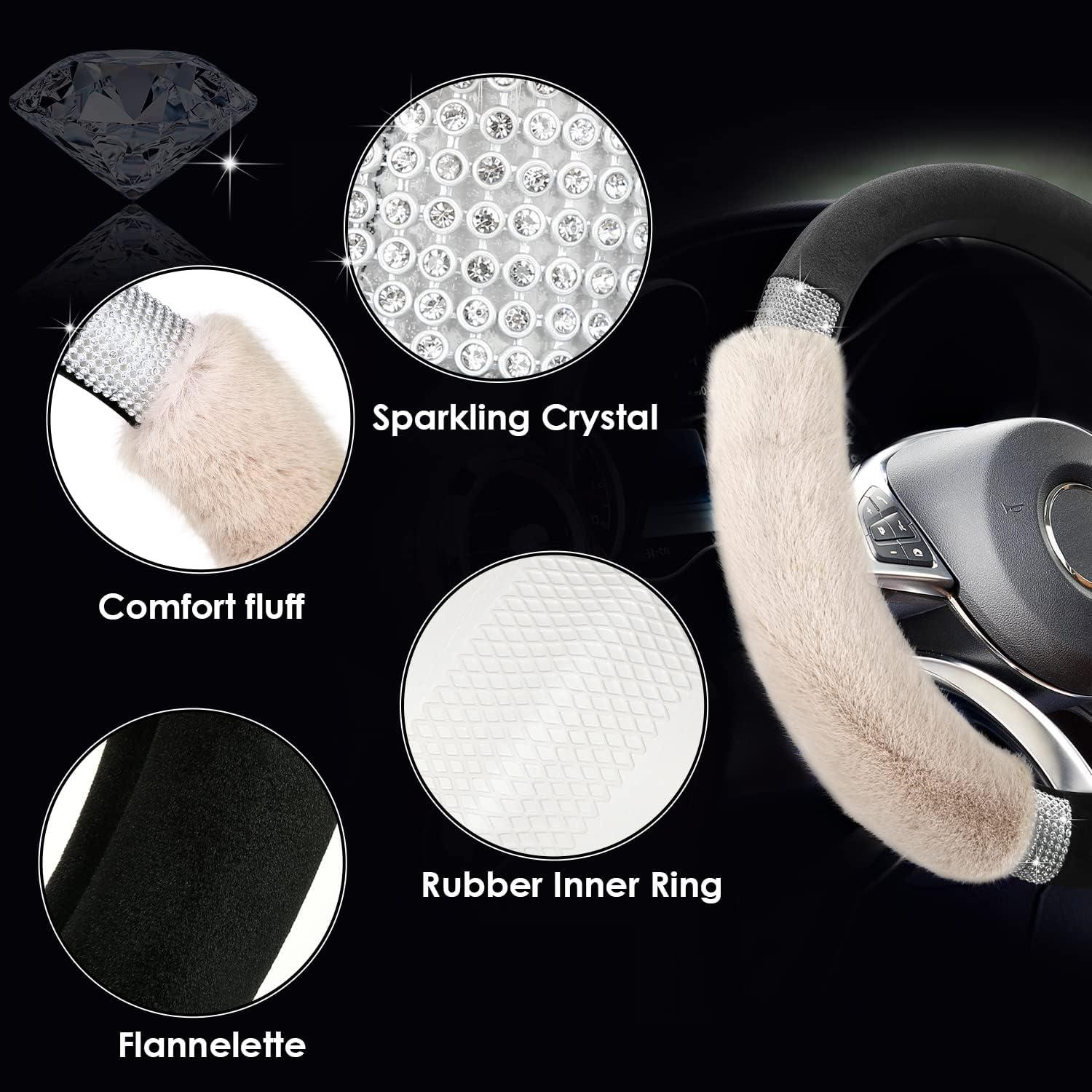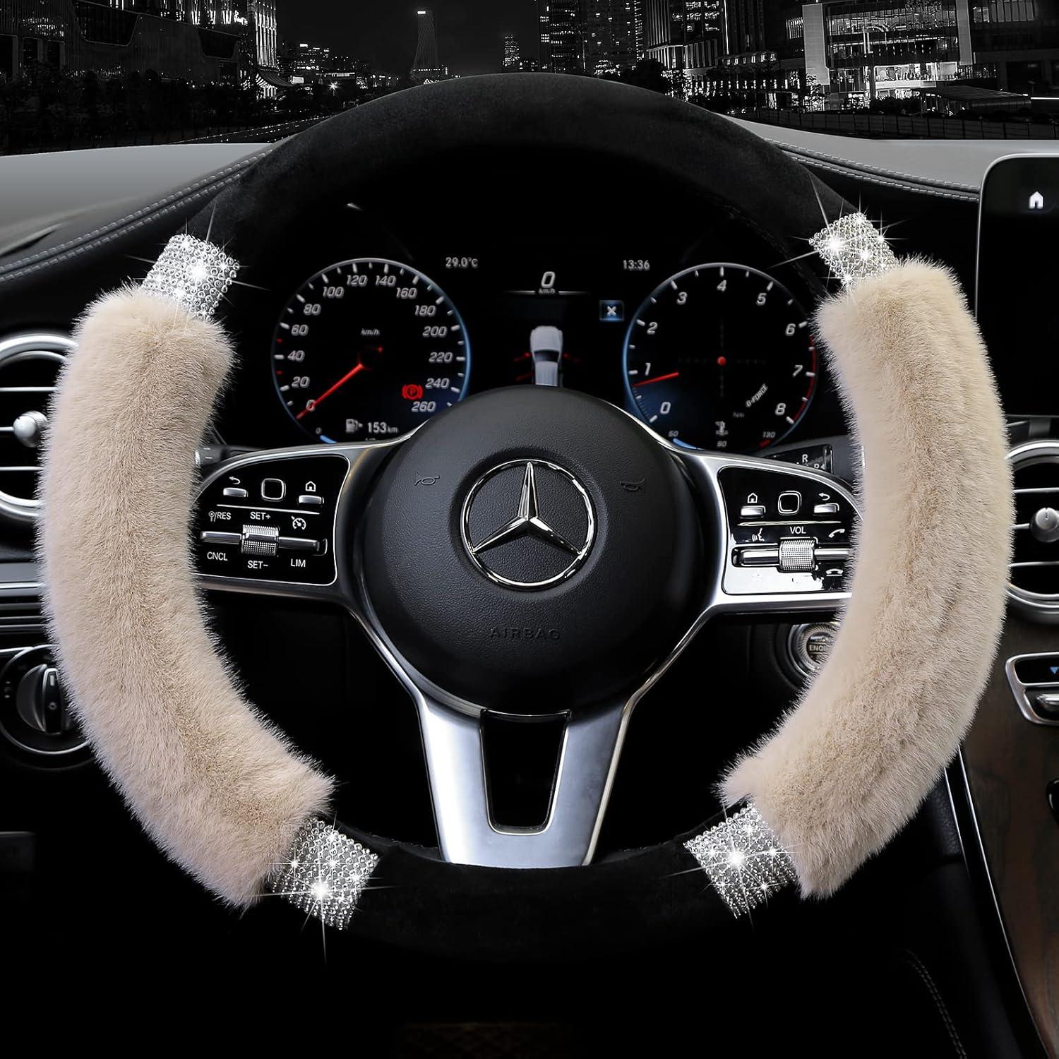 Achiou Rhinestone Fluffy Steering Wheel Cover – Comfortable Non-Slip Luxury Faux Wool, Universal Fit for 14.5″ to 15″ Steering Wheels(Black and White)