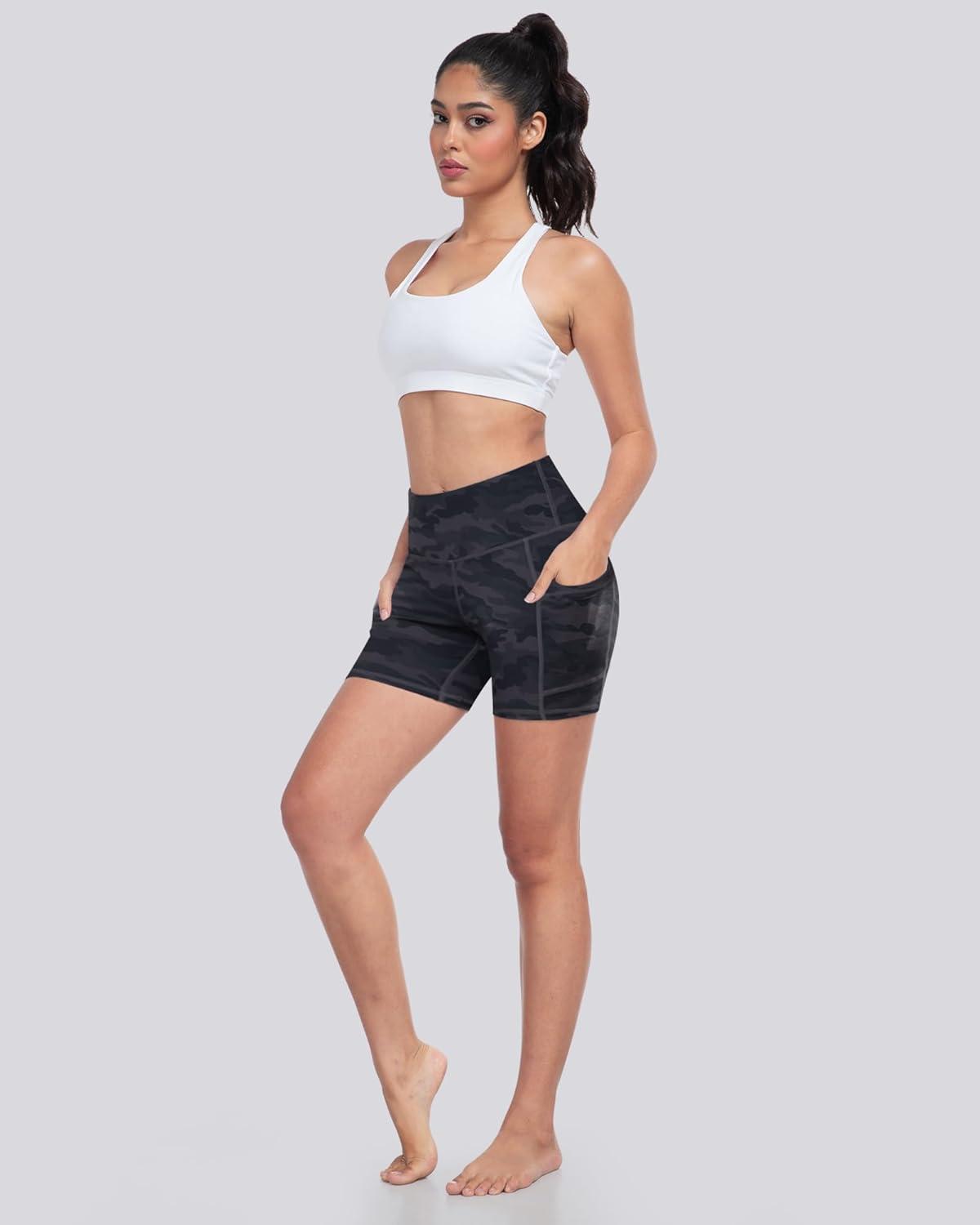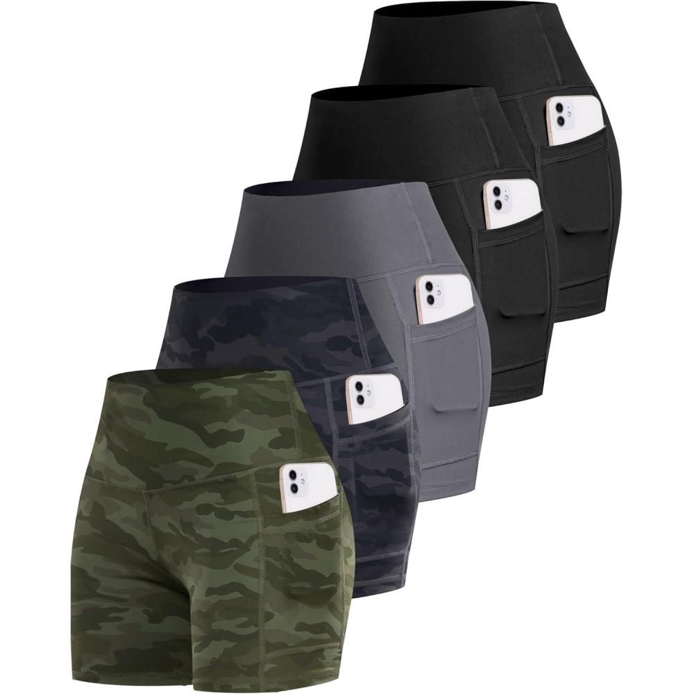 LZYVOO Biker Spandex Shorts Women, High Waisted Tummy Control Workout Yoga Shorts with Pockets(5packs – Black/Black/Dark Gray/Camo Green/Camo Gray)