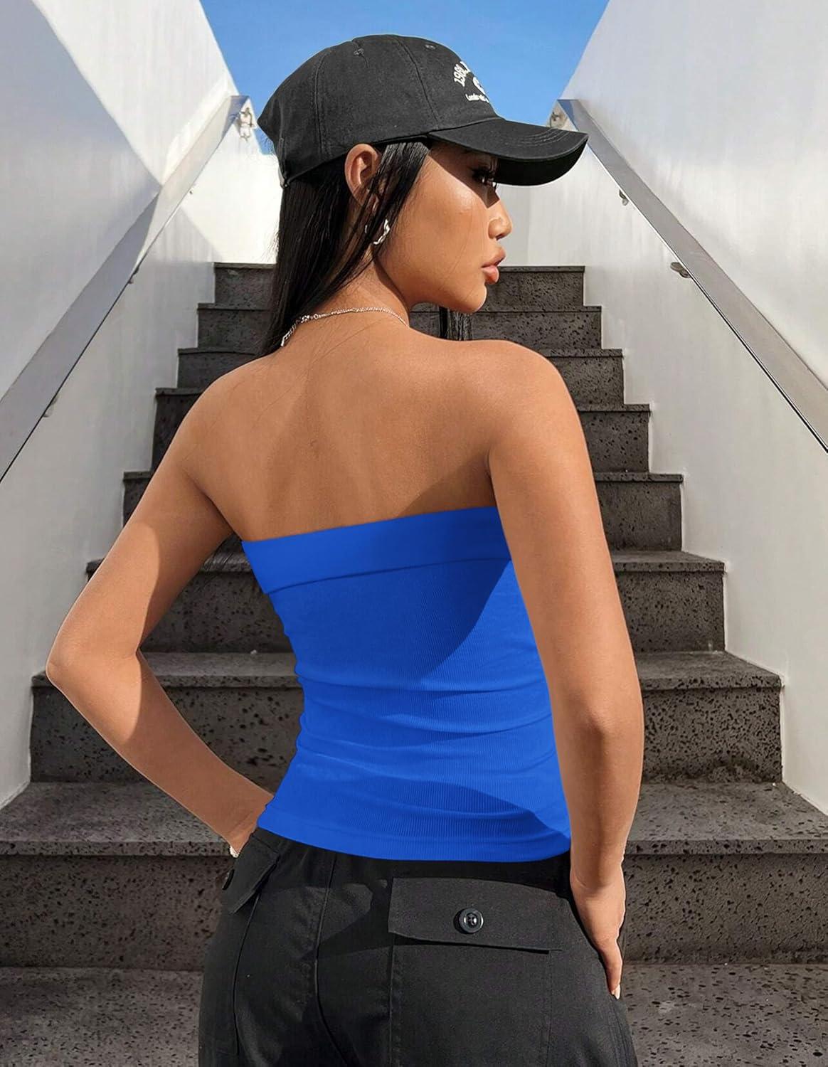 OLCHEE Womens 2PK Tube Tops Off Shoulder Seamless Ribbed Strapless Sleeveless Side Ruched Slim Fitted Summer Going Out Top(White + Royal Blue)