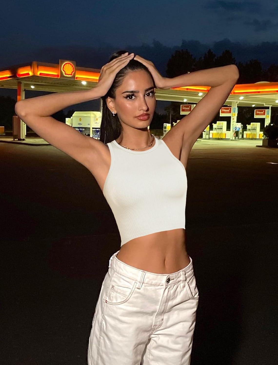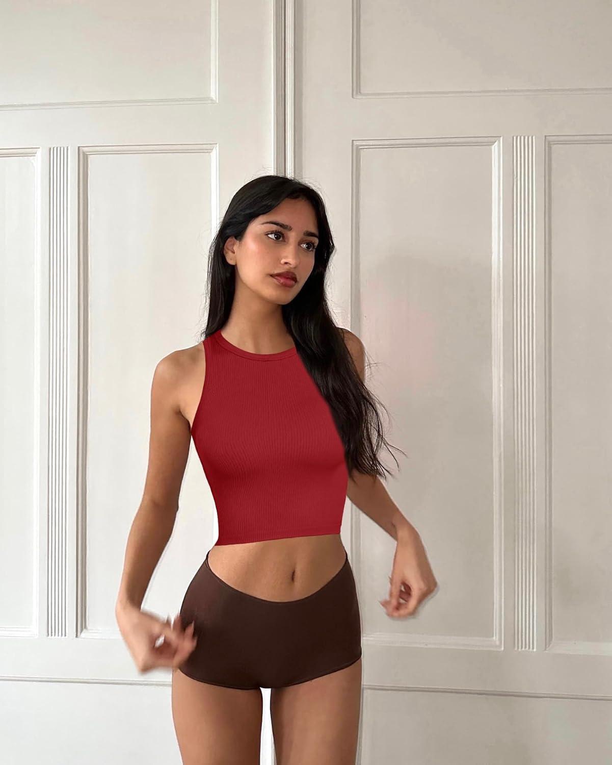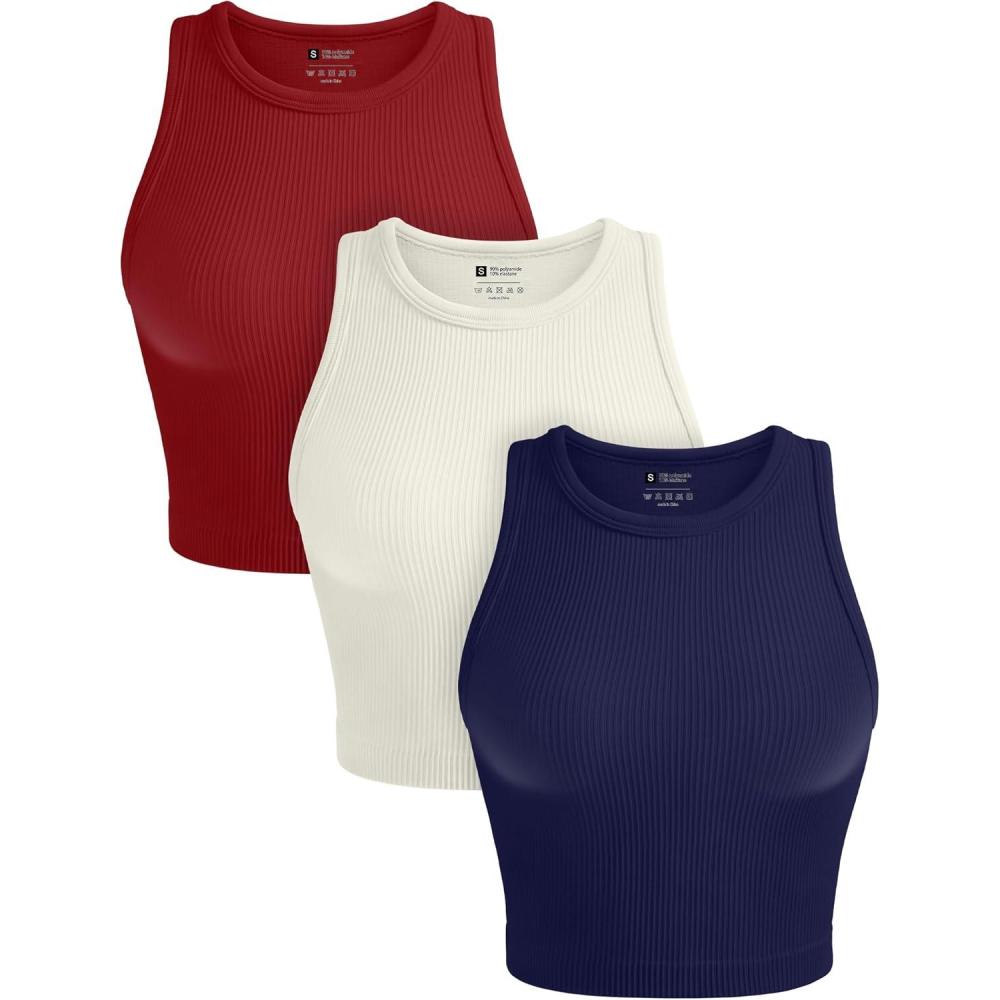 OLCHEE Womens 3 Pack Crop Tank Tops Basic Seamless Ribbed Round High Neck Racerback Workout Top Summer Causal Yoga Gym Shirts(Navy + Beige + Red)