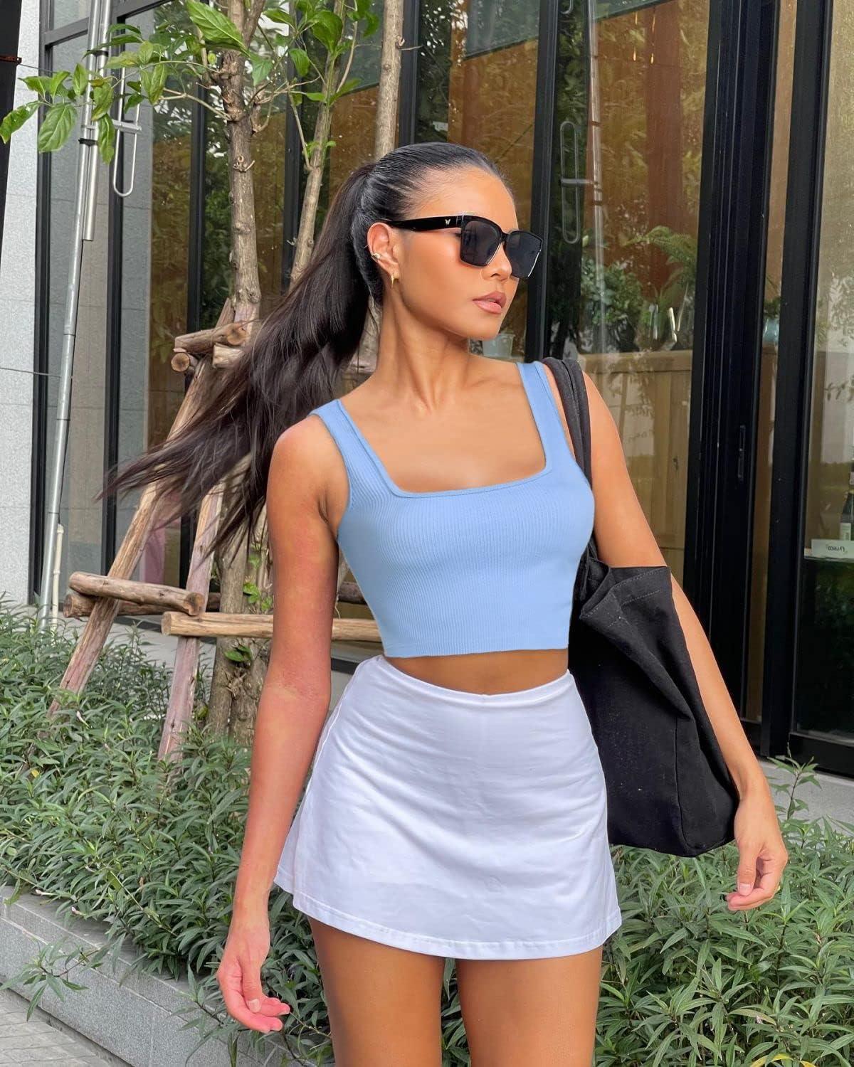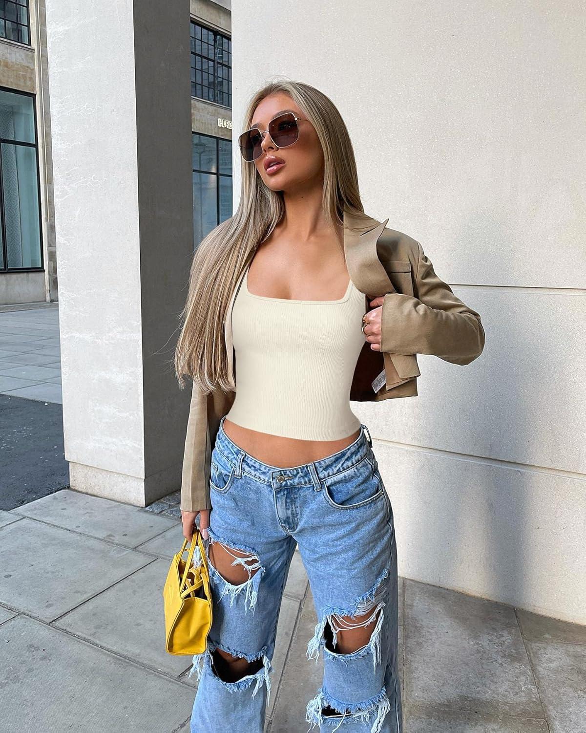 OLCHEE Womens 3 Pack Crop Tank Tops Basic Seamless Ribbed Sleeveless Square Neck Workout Top Summer Exercise Yoga Gym Shirts(Black + Beige + Light Blue)