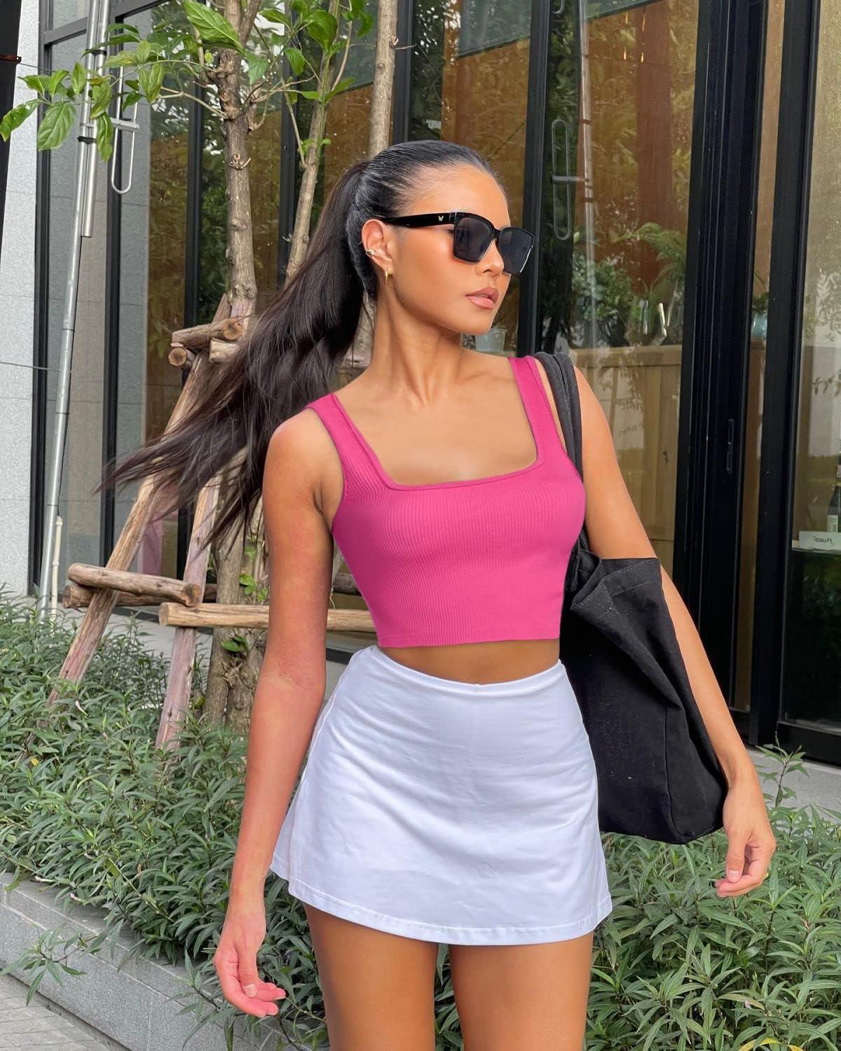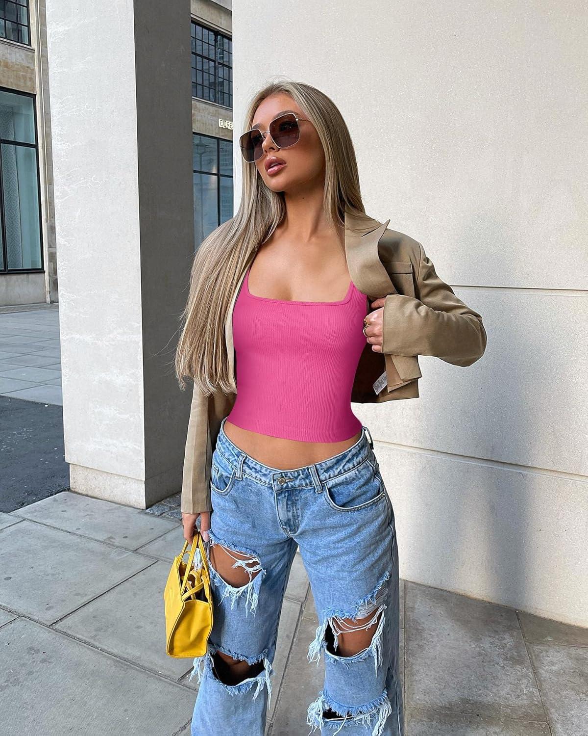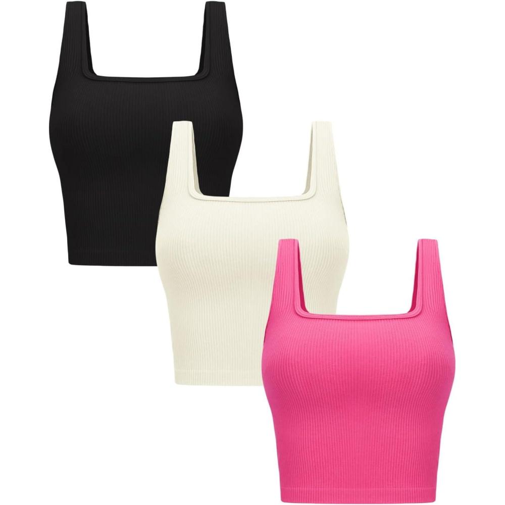 OLCHEE Womens 3 Pack Crop Tank Tops Basic Seamless Ribbed Sleeveless Square Neck Workout Top Summer Exercise Yoga Gym Shirts(Black + Beige + Rose)