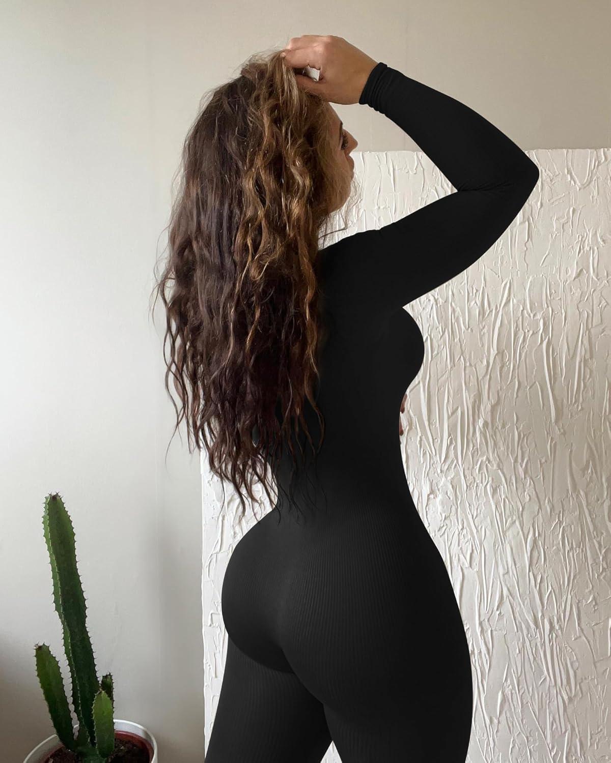 OLCHEE Womens Long Sleeve Workout Jumpsuit Square Neck Ribbed Seamless Yoga Romper Sexy Bodycon Tummy Control Unitard Onesie(Leggings: Black)