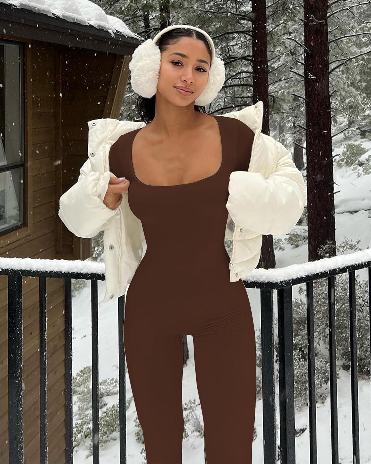 OLCHEE Womens Long Sleeve Workout Jumpsuit Square Neck Ribbed Seamless Yoga Romper Sexy Bodycon Tummy Control Unitard Onesie(Leggings: Brown)