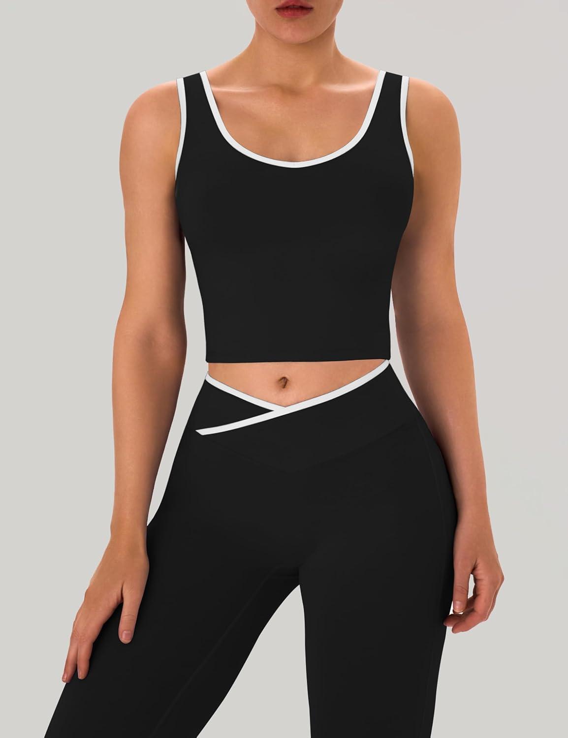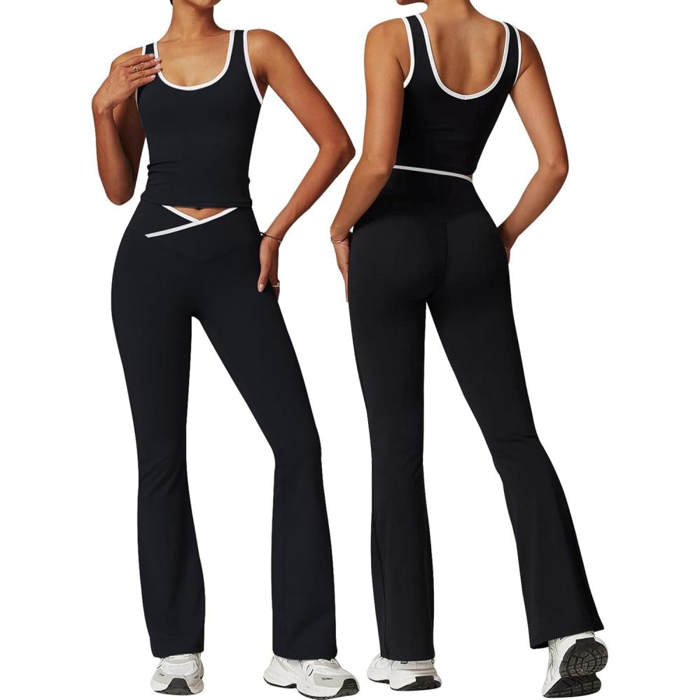 OLCHEE Womens Workout Sets 2 Piece Gym Yoga Outfits Crossover Flare Leggings Crop Tank Top with Contrast Trim(Black)