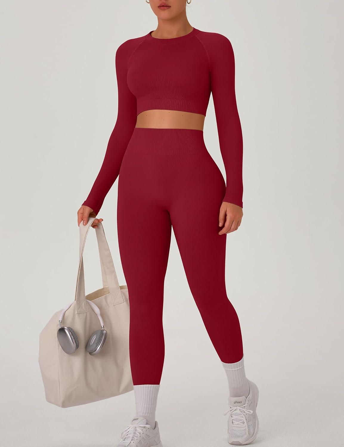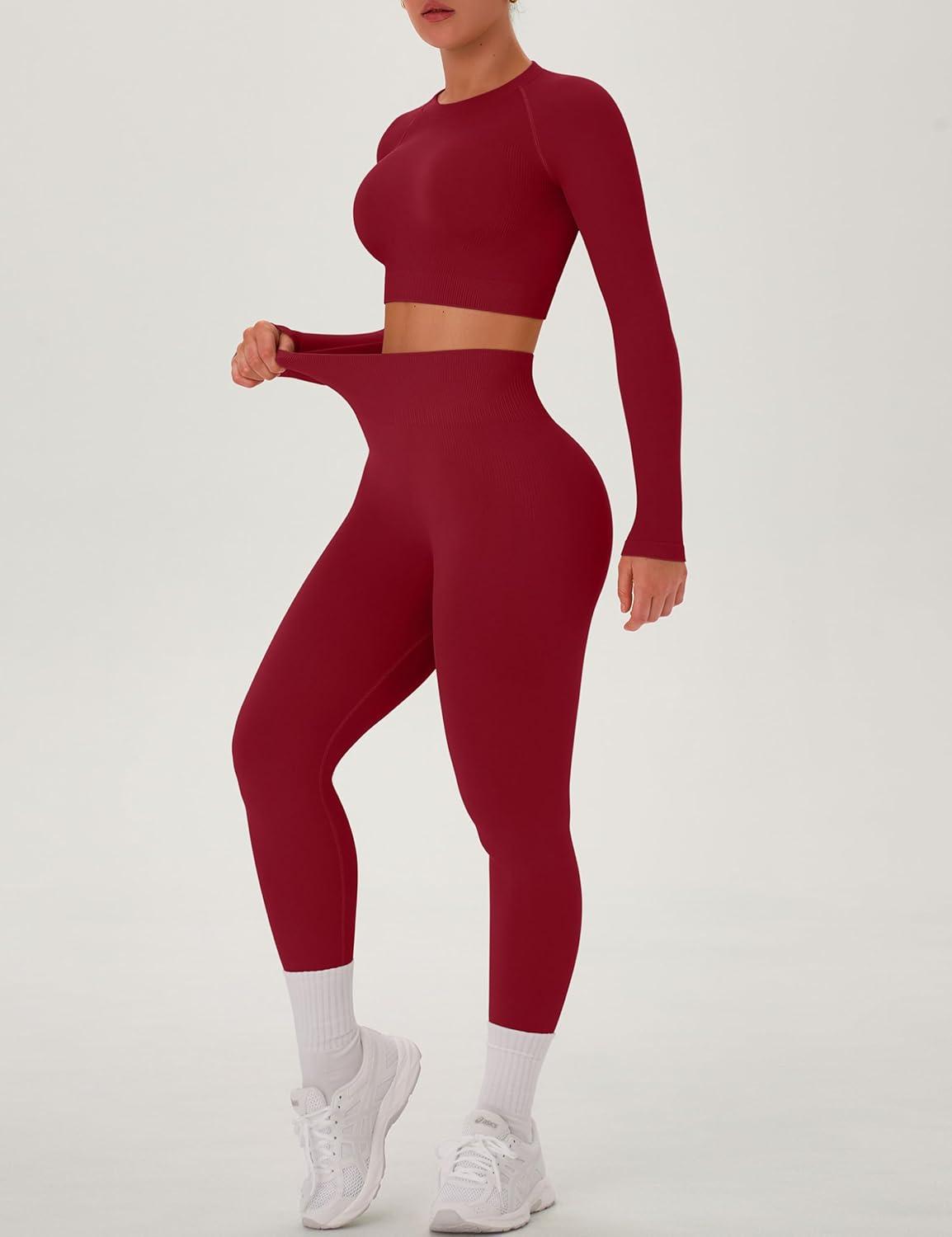 OLCHEE Womens Workout Sets 2 Piece Seamless Long Sleeve Crew Neck Crop Top Shirts Scrunch Butt Leggings Gym Yoga Outfits(Cherry Red)