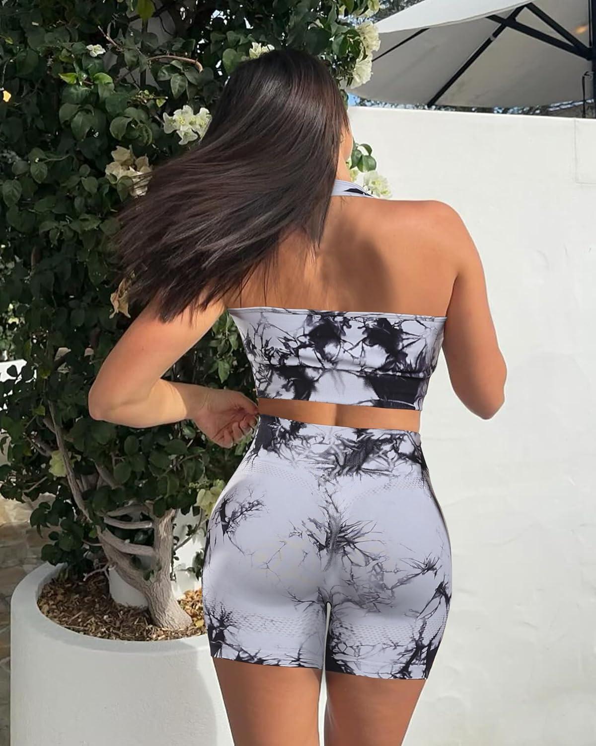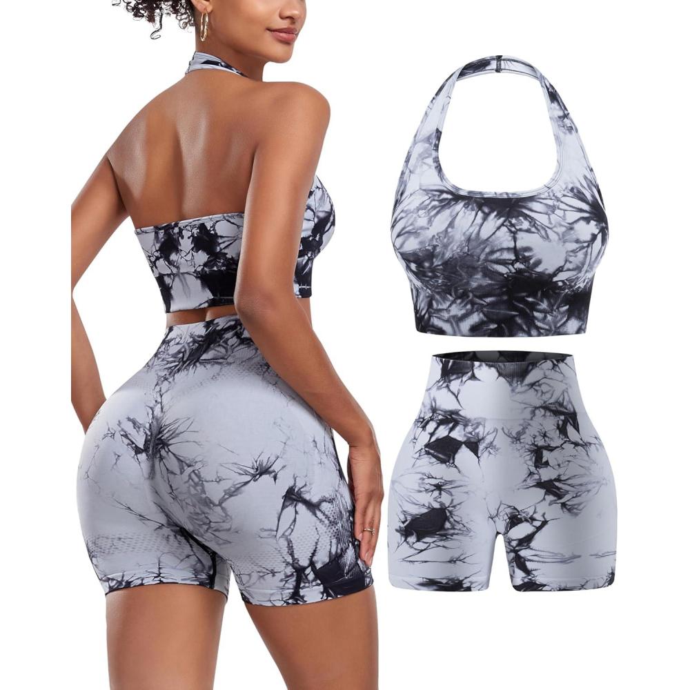 OLCHEE Workout Sets for Women 2 Piece Backless Halter Sports Bra High Waist Booty Shorts Yoga Gym Outfits Lounge Activewear(Tie Dye Black Gray)